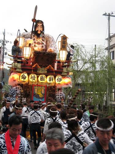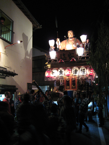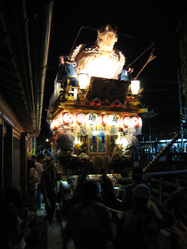提灯の明かりを揺らしながら古い町並みをゆく山車。