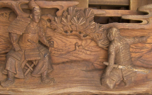 この彫刻の左側に床机に座っている武将は、小楠公こと楠正行です。