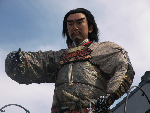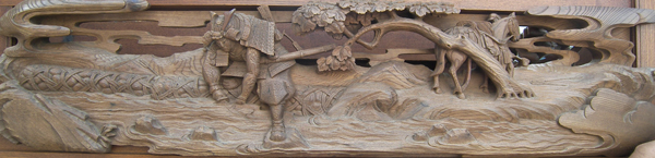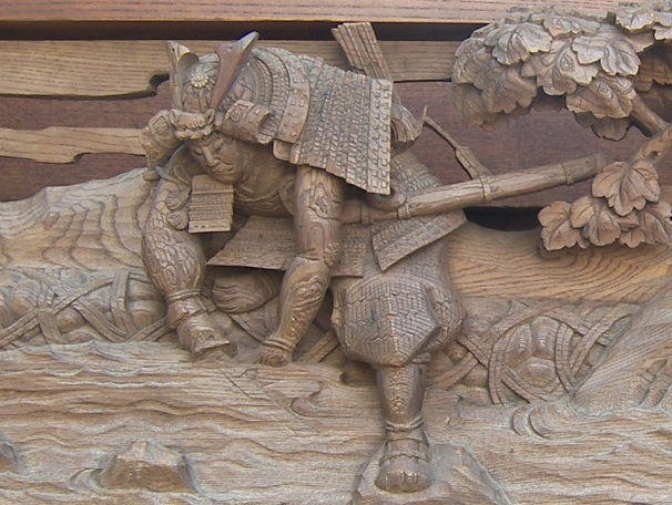 この彫刻には南北朝時代の武将、菊池武光が描かれています。