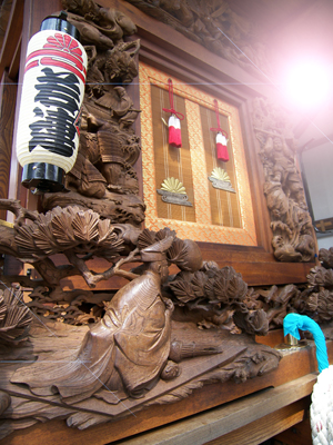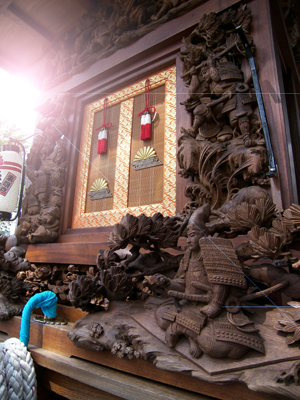 全体に彫刻が施され上部には、唐破風につく懸魚の様に大きな鳳凰の彫刻が取り付けられています。